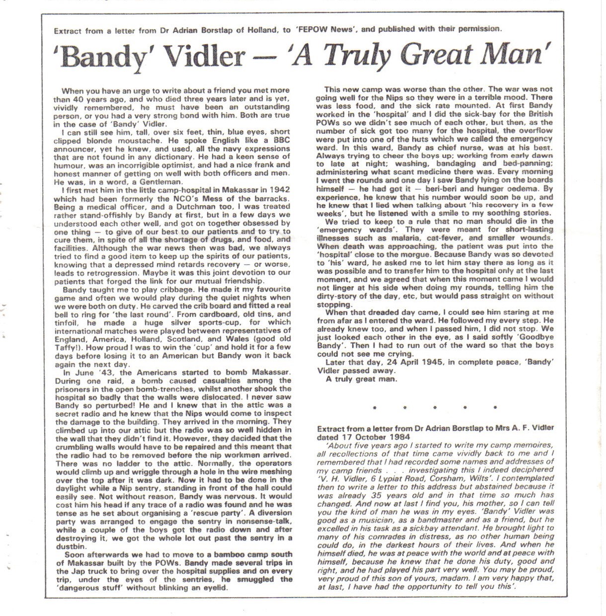 The story of RM Bandsman Vidler who sadly didn't return from his time as a PoW. Below the newspaper article and his headstone in memory.